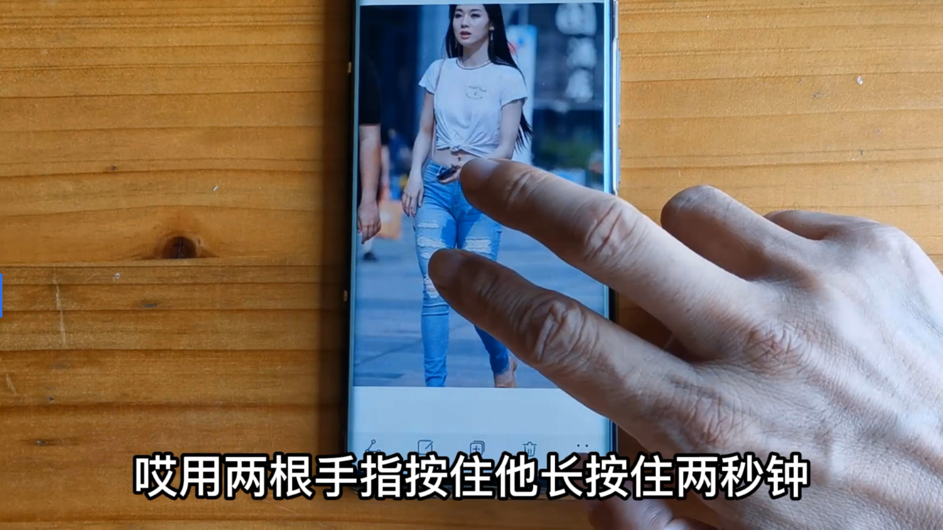 当我们在手机上看到心仪的东西的时候,如下图中美女穿着的牛仔被,我们觉得非常好看,也想买一件同款,这个时候,我们只需要用2根手指,长按手机屏幕上的这个美女图片。