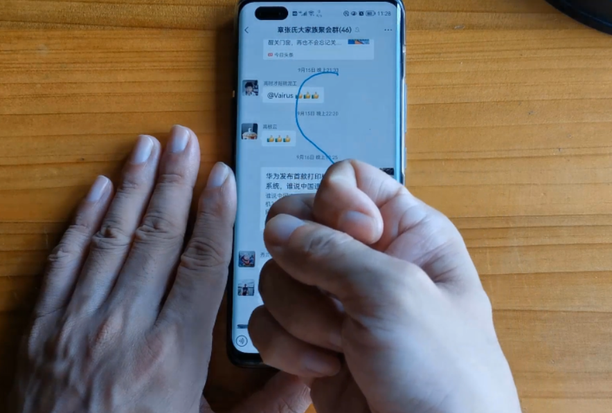 长载屏也是华为手机一个非常好用的功能。当我们想把“某个微信聊天内容”截屏分享给好友看,可是聊天内容太长时;当我们浏览到一个“内容非常好的网页”想截屏,而网页内容太长时,这个时候,我们就可以使用华为手机自带的“长截屏”功能,就可以很轻松地把整个微信聊天记录或长网页截屏成一个长图。我们只需要通过一根手指的指关节,在屏幕上画一个S形,如下图。