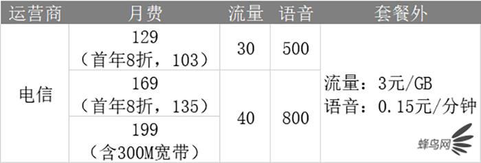 电信方面选择相对较少一些,包含 129、169 和 199 三个档位,其中 129 和 169 两档目前有首年 8 折的优惠,相当于每月仅需 103 元和 135 元,分别对应 30GB 国内流量、500 分钟通话时长和 40GB 国内流量、800 分钟通话时长。而 199 元套餐则除了拥有 40GB 国内流量和 800 分钟通话时长外,还拥有一条 300M 宽带。