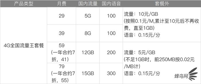 如果希望月费较低,大量使用手机的场景都有 WIFI,同时有较少的流量和语音需求,则可以选择 "4G 全国流量王套餐 ",起步月费只需 29 元。具体见下表: